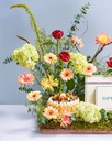 Create a unique arrangement featuring a blend of special flowers and a mini cake presented on an Opus tray. The ensemble includes Gerbera, Matthiola, Mini Chrysanthemum, Stoma, and adorned with delicate touches of eucalyptus leaves.